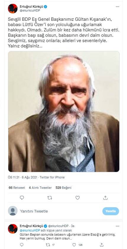 Durumu fırsat bilen samanlık devrimcisi HDP’li Ertuğrul Kürkçü ise AK Parti hükümetini hedef aldı. Hükümetin Kışanak'ın babasının cenazesine katılmasına izin vermediğini iddia eden Kürkçü sosyal medya hesabından yaptığı paylaşımda şu ifadeleri kullandı: