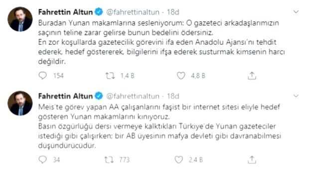 Yunanistan'daki provokatif gelişmenin ardından sosyal medya hesabından açıklama yapan İletişim Başkanı Fahrettin Altun, ''Buradan Yunan makamlarına sesleniyorum: O gazeteci arkadaşlarımızın saçının teline zarar gelirse bunun bedelini ödersiniz" ifadelerini kullanmıştı.