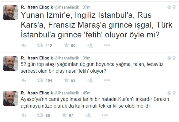 Taksim'de başlayan ve Türkiye'nin birçok ilinde terör eylemlerine dönüşen Gezi kalkışması sırasında cuma namazı kıldıran, bu yüzden adı "Gezi imamı"na çıkan İhsan Eliaçık, İstanbul'un Fethi ile ilgili skandal sözler sarfetti.
