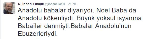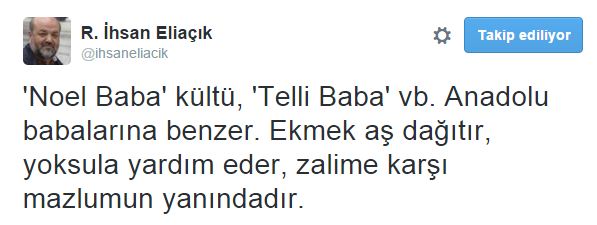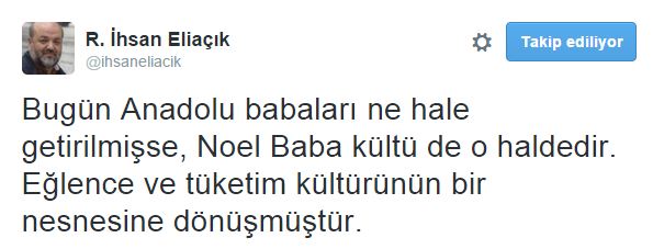 ‘Gezi imamı’ olarak bilinen İhsan Eliaçık, Hristiyan geleneği olan Noel Baba tartışmalarına ilişkin tepki çeken açıklamalarda bulundu. Eliaçık, “Noel Baba kültü, 'Telli Baba' vb. Anadolu babalarına benzer” dedi.