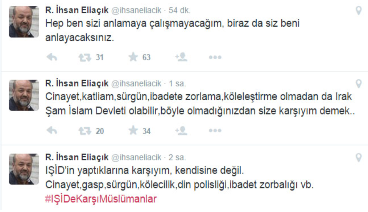 Kişisel Tiwtter hesabından paylaştığı mesajda, “IŞİD’in yaptıklarına karşıyım, kendisine değil. Cinayet, gasp, sürgün, kölecilik, din polisliği, ibadet zorbalığı” diyen Eliaçık’ın sözleri, özellikle kendisini destekleyen Gezicileri şoke etti.
