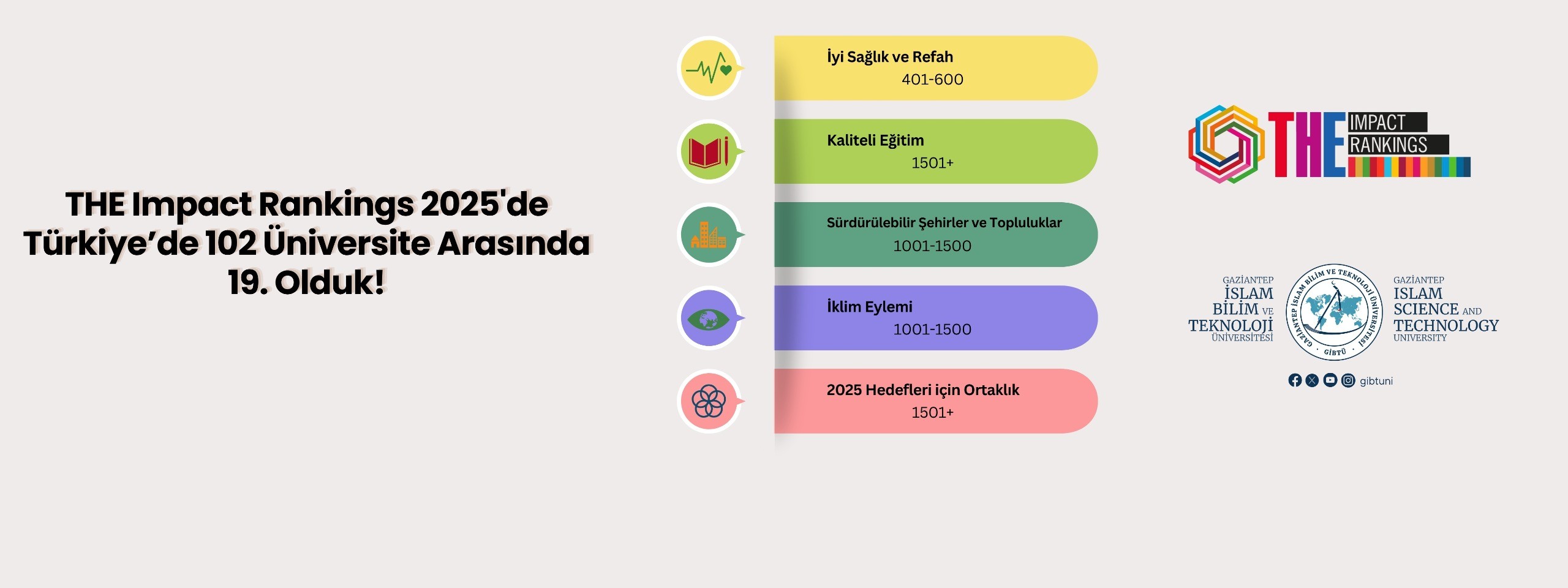 Gaziantep İslam Bilim ve Teknoloji Üniversitesi (GİBTÜ), Times Higher Education (THE) tarafından yayınlanan 2025 Etki Sıralamasına ilk kez girerek büyük bir başarıya imza attı. GİBTÜ Rektörü Prof. Dr. Şehmus Demir, “Üniversitemizin ilk kez katıldığı THE Etki Sıralamasında elde ettiği bu sonuç, bilim ve toplum odaklı çalışmalarımızın uluslararası düzeyde tanınırlığını kanıtlıyor.” dedi.