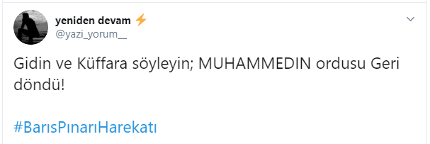 Kahraman Mehmetçik'e destek veren binlerce vatandaş, dikkat çeken mesajlar paylaştı. Bir kullanıcı, "Gidin ve küffara söyleyin; Muhammed'in ordusu geri döndü!" ifadesini kullandı. Bu mesaj onlarca beğeni aldı.