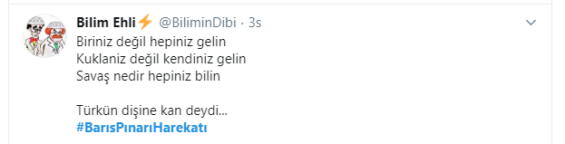 Fırat'ın doğusuna operasyon sinyali veren Cumhurbaşkanı Erdoğan'ın kullandığı "Barış Pınarları" ifadesi sonrası, sosyal medyada "#BarışPınarıHarekatı" etiketiyle birçok mesaj paylaşıldı. Mehmetçik'e destek veren binlerce sosyal medya kullanıcısı, dikkat çeken mesajlar paylaştı.