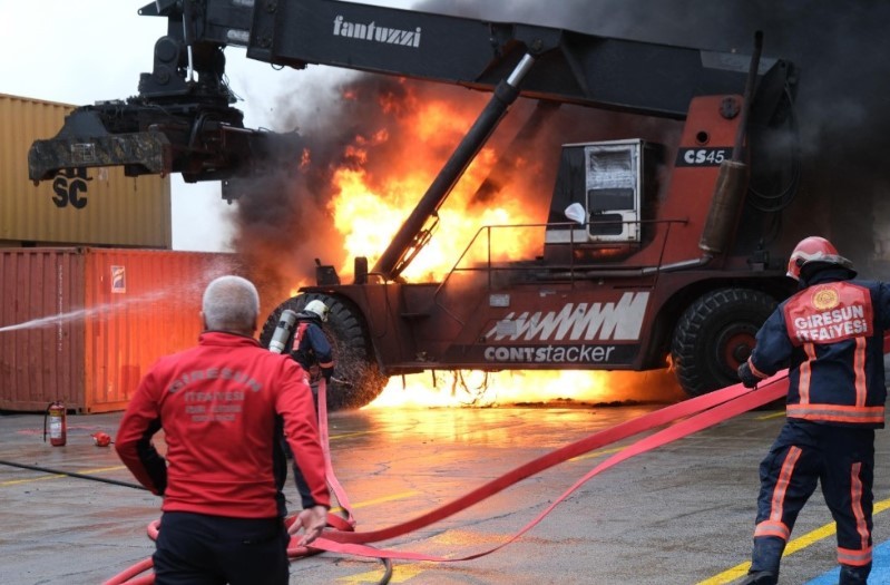 Tiryaki Holding bünyesindeki Giresunport Liman İşletmeciliği A.Ş.’nin faaliyet gösterdiği limanda, bir iş makinesinin elektrik aksamından kaynaklanan yangın çıktı. Kısa sürede alevlerin sardığı iş makinesindeki yangının, çevredeki tahıl depolarına sıçramaması için Giresun Belediyesi İtfaiye ekipleri hızla müdahale etti.