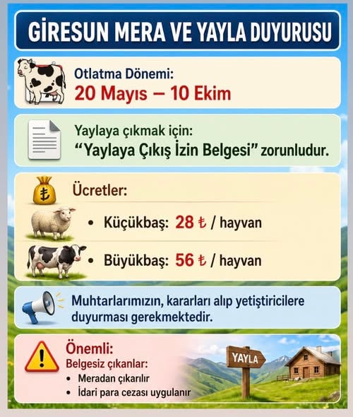 Giresun Valiliği koordinasyonunda toplanan Mera Komisyonu, hayvancılıkla uğraşan vatandaşların heyecanla beklediği 2026 yılı yayla ve mera kullanım esaslarını karara bağladı. Yeni düzenlemeyle birlikte yaylaya çıkış tarihleri netleşirken, hayvan başına ödenecek otlatma ücretleri ve uyulması gereken disiplin kuralları kamuoyuna duyuruldu.