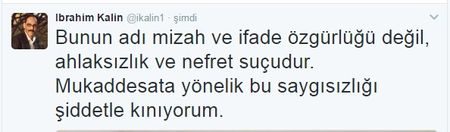 Cumhurbaşkanı Başdanışmanı İbrahim Kalın da skandal karikatüre tepki gösterirken "Bunun adı mizah ve ifade özgürlüğü değil, ahlaksızlık ve nefret suçudur. Mukaddesata yönelik bu saygısızlığı şiddetle kınıyorum." ifadelerini kullandı.