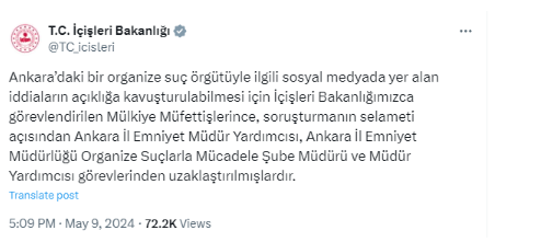 Bakanlığın sosyal medya hesabından yapılan açıklamada şu ifadelere yer verildi: "Ankara'daki bir organize suç örgütüyle ilgili sosyal medyada yer alan iddiaların açıklığa kavuşturulabilmesi için İçişleri Bakanlığımızca görevlendirilen Mülkiye Müfettişlerince, soruşturmanın selameti açısından Ankara İl Emniyet Müdür Yardımcısı M.Ç., Ankara İl Emniyet Müdürlüğü Organize Suçlarla Mücadele Şube Müdürü K.G.Ö. ve Müdür Yardımcısı Ş.D. görevlerinden uzaklaştırılmışlardır."