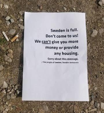 Akesson ile kurmayının dağıttığı el ilanlarında da "Bize gelmeyin. İsveç dolu. Size daha fazla para veremeyiz, konut sağlayamayız. Bu mesaj için üzgünüm. İsveç halkı, İsveç Demokratları" yazdığı görüldü.