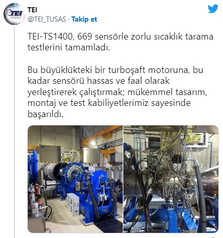 TEI, Twitter hesabından TS1400 turboşaft motorunun 669 sensörün kullanıldığı sıcaklık tarama testini tamamladığını, "TEI-TS1400, 669 sensörle zorlu sıcaklık tarama testlerini tamamladı. Bu büyüklükteki bir turboşaft motoruna, bu kadar sensörü hassas ve faal olarak yerleştirerek çalıştırmak; mükemmel tasarım, montaj ve test kabiliyetlerimiz sayesinde başarıldı" ifadeleriyle duyurmuştu.