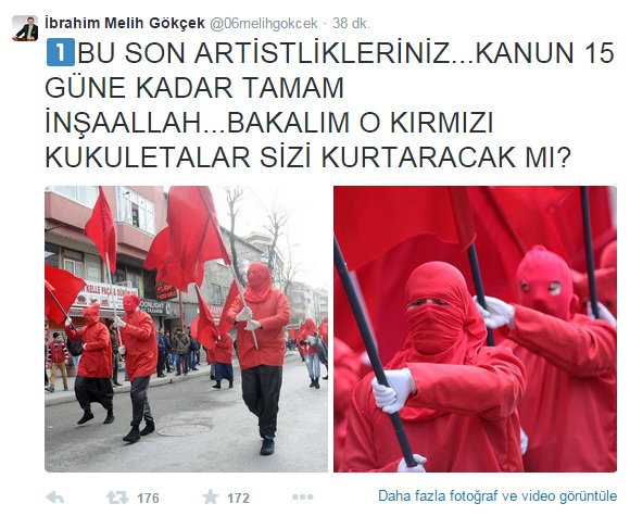 Bunun üzerine Ankara Büyükşehir Belediye Başkanı Melih Gökçek, Twitter hesabı üzerinden, provokasyon yapan gruplara yüklendi. Gökçek, "Bu son artistlikleriniz. Kanun 15 güne kadar tamam inşallah. Bakalım o kırmızı kukuletalar sizi kurtaracak mı?" ifadelerini kullandı.