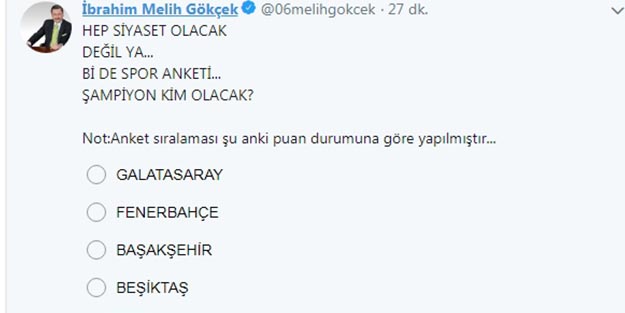 Ankara Büyükşehir'in Eski Başkanı Melih Gökçek, Süper Lig'de şampiyon kim olur sorusunu takipçilerine anket şeklinde sordu.