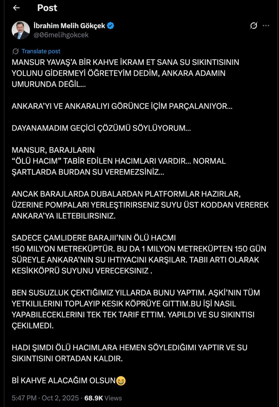 İşte Melih Gökçek'in Mansur Yavaş'a susuzlukla ilgili verdiği cevap...