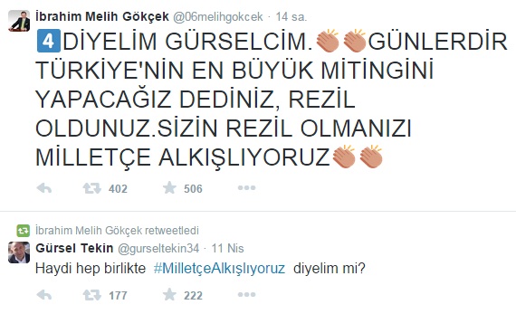 YENİAKİT.COM.TR - CHP lideri Kemal Kılıçdaroğlu dün Kartal'da "Milletçe Alkışlıyoruz" temasıyla seçmene seslendi. Kalabalık olmayan miting bir hayli alay konusu oldu. Son olarak Ankara Büyükşehir Belediye Başkanı Melih Gökçek, Twitter'dan CHP Genel Sekreteri Gürsel Tekin'in, "Haydi hep birlikte MilletçeAlkışlıyoruz diyelim mi?" twitini paylaşarak, "Diyelim Gürselcim, günlerdir Türkiye'nin en büyük mitingini yapacağız dediniz, rezil oldunuz. Sizin rezil olmanızı milletçe alkışlıyoruz" yorumunu yaptı.