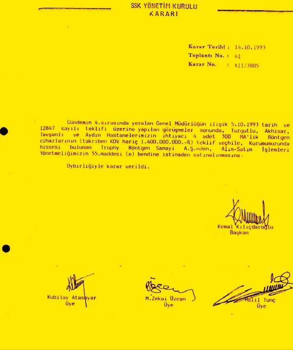 Başkan Gökçek, "İşte ilk belgeler...KK, SSK'da üç yıl üst üste aynı malı bakın hangi fiyattan almış...bana bunu izah edeceksin KK...kaçma, kıvırma yok..." mesajını atarak, Kemal Kılıçdaroğlu'nun altında imzası bulunan belgeleri twitledi. Her paylaştığı belgenin altından Gökçek, şu yorumları yazdı: "Yıl 1993...1 adet 300 MA'lık röntgen cihazı 350.000.000 TL... 4 adeti 1.400.000.000 TL. Altında KK'nın imzası. Yıl 1994...13 röntgen cihazı alınmış. Tanesi 2.434.615.384 TL. (Toplam 31.650.000.000 TL. İmza KK.. Sevgili KK, bir yılda fiyatlar 350.000.000 TL'den 2.434.615.384 TL'ye nasıl çıktı? Kıvırmadan izah bekliyoruz... Aynı konuda üçüncü belgeni de yayımlamamı ister misin? Sadece ses ver yeter. Bir daha elinde ayakkabı kutusuyla seni görürsem sana bunu gönderirim. -Sevgili KK... Ben bunlardan yargılandım diye savunmaya filan geçme... Sen Rahşan affından yararlanan birisisin... Aç bana tazminat davası. Yargı önünde ispat edemezsem cezama razıyım... Tekrar ediyorum... Sen Türkiye'de yolsuzluk konusunda en son konuşacak kişisin..."