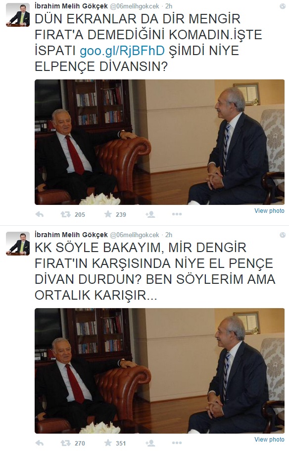 HDP'nin Meclis Başkan adayı Dengir Mir Mehmet Fırat'ın, CHP lideri Kemal Kılıçdaroğlu ile görüşmesi sırasında çekilmiş fotoğrafını Twitter'dan paylaşan Ankara Büyükşehir Belediye Başkanı Melih Gökçek, Kılıçdaroğlu'na çarpıcı bir soru yöneltti.