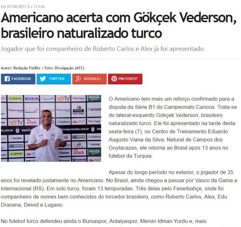 Gökçek Wederson'un transferi Brezilya basınında da geniş yer buldu.