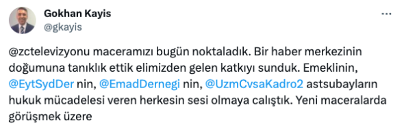 Sosyal medya hesabından “Sözcü TV maceramızı bugün noktaladık. Bir haber merkezinin doğumuna tanıklık ettik elimizden gelen katkıyı sunduk. Emeklinin ve astsubayların hukuk mücadelesi veren herkesin sesi olmaya çalıştık” paylaşımında bulunan Gökhan Kayış, “Yeni maceralarda görüşmek üzere” ifadelerini kullandı.