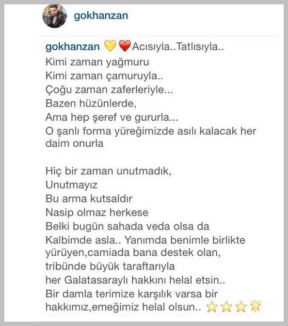 "Acısıyla..Tatlısıyla.. Kimi zaman yağmuru, kimi zaman çamuruyla.. Çoğu zaman zaferleriyle... Bazen hüzünlerde, ama hep şeref ve gururla... O şanlı forma yüreğimizde asılı kalacak her daim onurla. Hiç bir zaman unutmadık, unutmayız. Bu arma kutsaldır, nasip olmaz herkese. Belki bugün sahada veda olsa da kalbimde asla.. Yanımda benimle birlikte yürüyen,camiada bana destek olan, tribünde büyük taraftarıyla her Galatasaraylı hakkını helal etsin.. Bir damla terimize karşılık varsa bir hakkımız,emeğimiz helal olsun.."