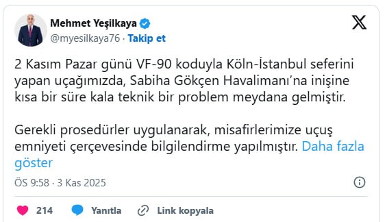 AJet Basın Müşaviri Mehmet Yeşilkaya sosyal medya aracılığıyla yaptığı açıklamada da "2 Kasım Pazar günü VF-90 koduyla Köln-İstanbul seferini yapan uçağımızda, Sabiha Gökçen Havalimanı’na inişine kısa bir süre kala teknik bir problem meydana gelmiştir." dedi.