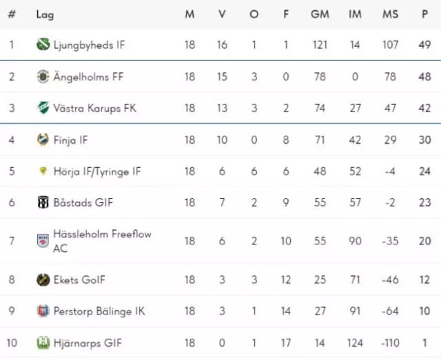 Angelholms FF, 18 maçtan oluşan ligde; 15 galibiyet ve 3 beraberlik alıp sezonu 48 puanla namağlup tamamlamadı. Ljungbyheds IF takımı 16 galibiyet 1 mağlubiyet ve 1 beraberlik alarak toplam 49 puanla şampiyon oldu.