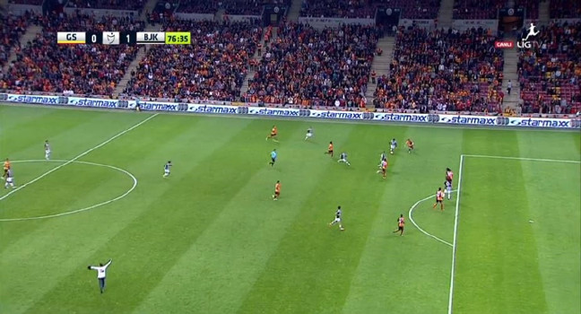 Süper Lig'in 32. haftasında Galatasaray evinde Beşiktaş'ı konuk ederken karşılaşmadan siyah-beyazlılar 1-0 üstün ayrıldı. Kara Kartal Mario Gomez ile öne geçerken sahadaki bir detay dikkatlerden kaçmadı. Mario Gomez'in golünden saniyeler önce sahaya bir taraftar girdi, buna karşın oyun devam etti.