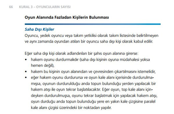 Eğer şöyle olsaydı, bir takım gole giderken sahaya dışarıdan bir kişinin müdahalesiyle pozisyon engellenseydi bu durumda hakemin maçı durdurması gerekirdi. Hakem oyunu durdurduğunda da hakem atışıyla maç kaldığı yerden devam eder.'