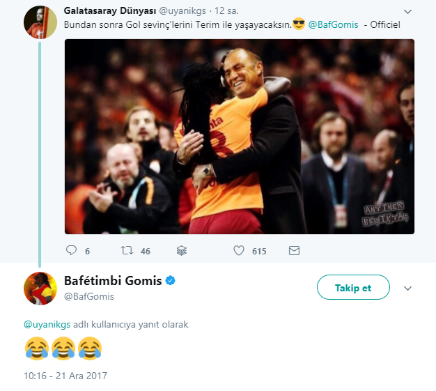 Twitter'da Igor Tudor ile gol sevincine photoshop ile Fatih Terim'in kafasını koyup fotoğrafı paylaşan ve 'Bundan sonra gol sevinçlerini Terim ile yaşayacaksın' yazan bir taraftara Gomis gülerek cevap verdi.