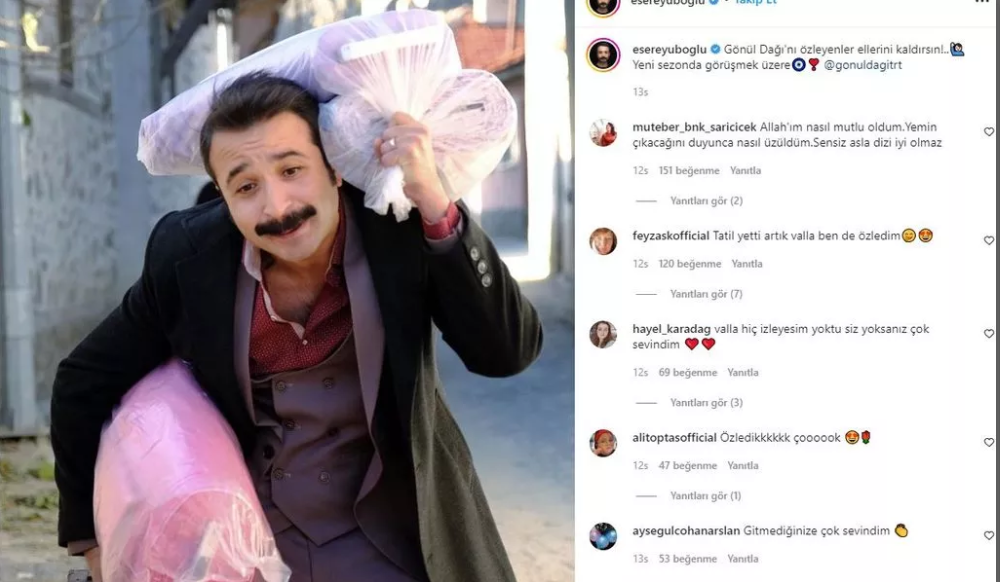 TRT’nin cumartesi akşamlarına damgasını vuran dizisi Gönül Dağı’nda Selami Ferses’e hayat veren Eser Eyüboğlu ayrılmıştı. Sahne programlarına da ağırlık vermek isteyen Eyüboğlu’nun ajansı da oyuncunun yeni projeler için müsait olduğunu ilan etmişti. Ancak taraflar arasında yeni bir gelişme oldu. Eser Eyüboğlu tekrar “Gönül Dağı”na dönme kararı aldı ve bu yeni gelişmeyi “Gönül Dağı’nı özleyenler ellerini kaldırsın! Yeni sezonda görüşmek üzere…” mesajıyla sosyal medya sayfasından yayınladı.