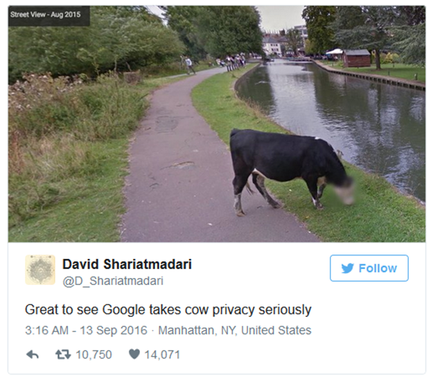 The Guardian'ın ABD'deki editörlerinden David Shariatmadari'nin fark ettiği aşağıdaki fotoğrafta, sığırın yüzüne herhangi bir gizlilik uygulanmamışken ineğin yüzünün tamamen bulanıklaştırıldığı görülüyor. Kendisine ulaşan Shariatmadari'nin gönderdiği fotoğraf sonrası konuyla ilgili açıklama yapan Google sözcüsü esprili bir dil kullanarak, otomatik bulanıklaştırma sisteminin çalışmaya çok istekli olduğunu ama yine de bu isteğin 'fazla gereksiz' olduğunu belirtti. Ayrıca daha fotoğrafın kendilerine ulaşmadan 'sanırım ineğin memeleri bulanıklaştırılmış' diye düşündüklerini, fotoğrafı gördükten sonra ise çok şaşırdıklarını söyledi.