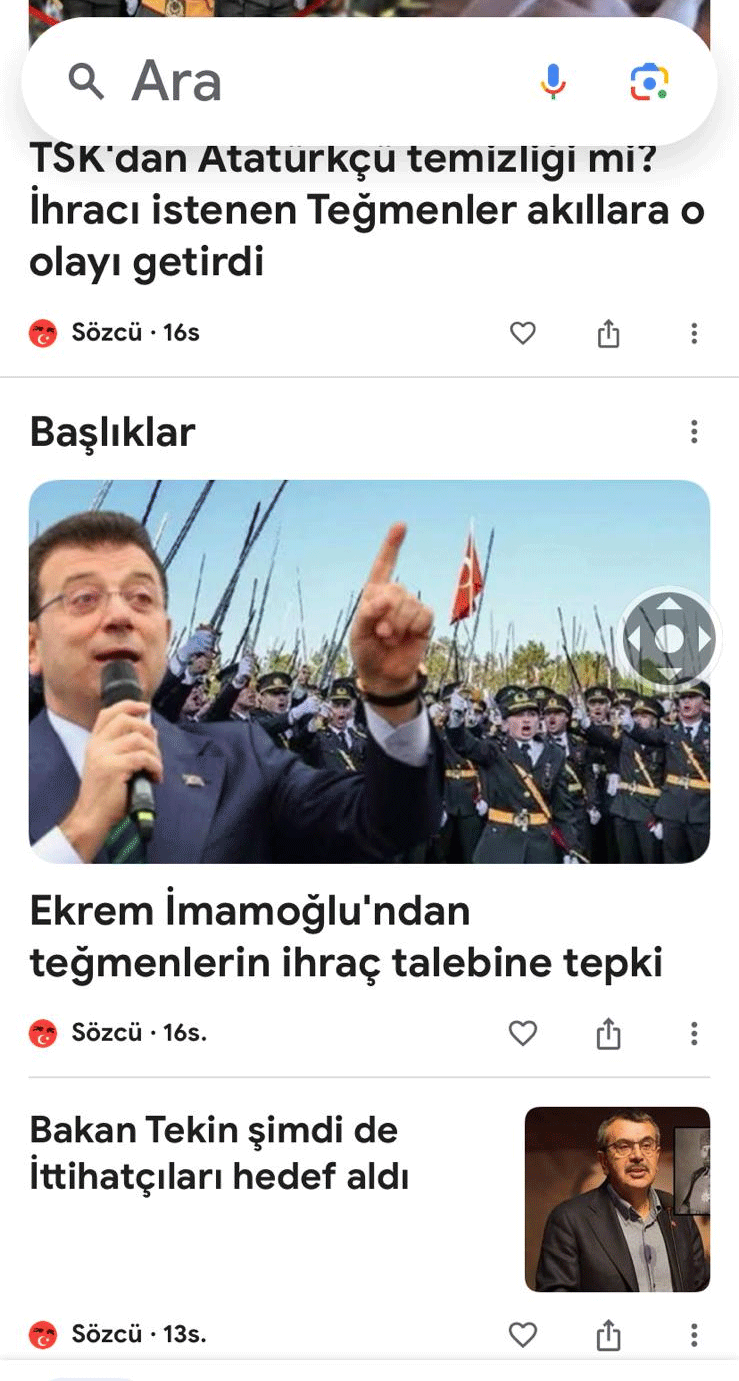 Google’ın Keşfet platformunda, farklı internet sitelerinden haberlerin kullanıcıların ilgisine sunulduğu bölümde, algı dolu operasyonel haberleriyle tanınan Sözcü gazetesine ait haberlerin yoğun şekilde ön plana çıkması dikkat çekiyor. Özellikle alt alta sıralanan Sözcü haberleri, kullanıcıların tepkisine neden oldu.