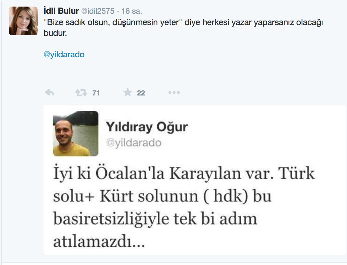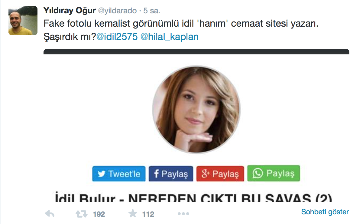 Gazeteci - Yazar Yıldıray Oğur Twitter’da kadın kılığına girip, Atatürkçü gibi ya da başka bir kimliktenmiş gibi davranan paralelcileri fena avladı. Oğur’un deşifre ettiği fake hesap, İdil Bulur adında profilinde Atatürkçü görünen bir paralelci operasyon çocuğu, yani trolü…