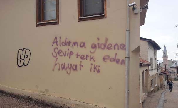 Olay, Maksem Caddesi'nde meydana geldi. Evinin belli bölgelerine güvenlik kamerası yerleştiren Kenan Sertalp'ın ekranına yansıyan görüntü, sosyal medyada tıklanma rekoru kırdı. Tatil dönüşü evinin duvarında, “Aldırma gidene, sevip terk edene, hayat iki...” şeklindeki yazıyı gören Sertalp, güvenlik kameralarını izledi. Bir genç kızın ezberinde olmayan bu cümleyi sprey boya ile duvara yazmaya çalıştığını, cümlenin ortasında spreyin bitmesiyle uzaklaştığını gördü. Bunun üzerine Sertalp, cümlenin sonunu merak ederek, görüntüyü ve yazıyı sosyal paylaşım sitesinde paylaşıp, takipçilerinden yazıyı tamamlamalarını istedi.