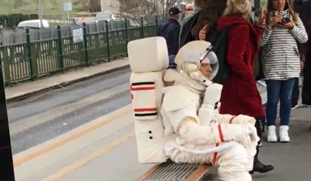 İstanbul'da Uzunçayır metrobüs durağında metrobüsün gelmesini bekleyen astronot kıyafetli bir vatandaş görenleri şaşırttı.