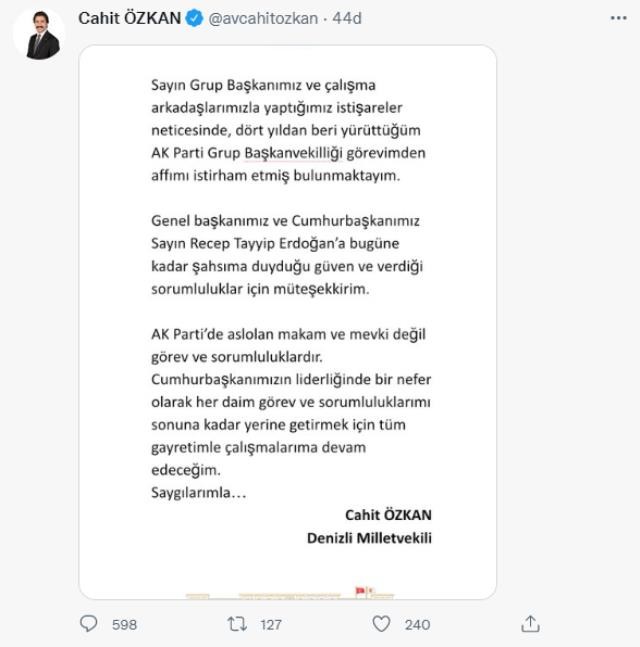 AK Parti Grup Başkanvekili Cahit Özkan, görevinden ayrılmasının ardından açıklamada bulundu.