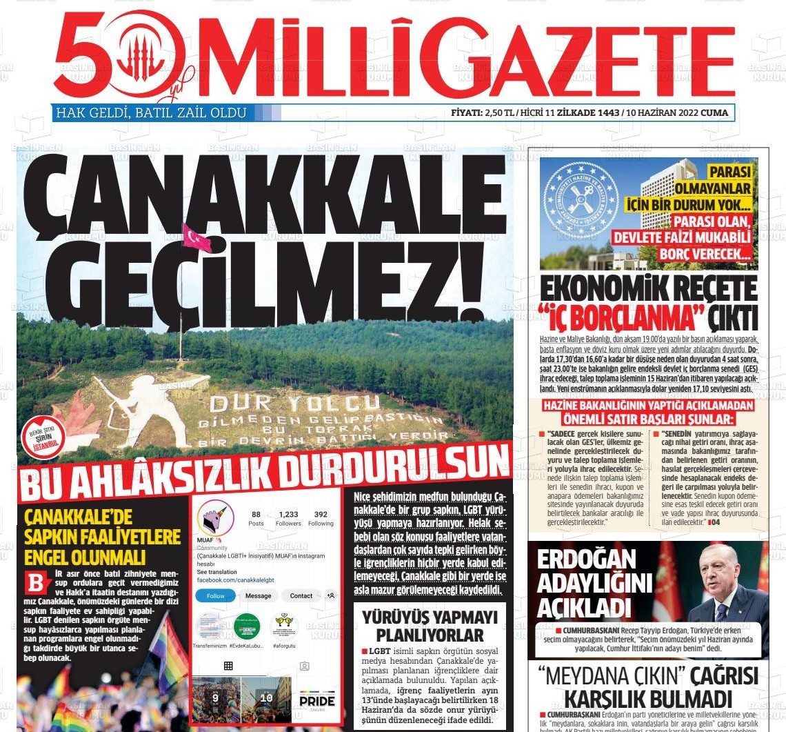 CHP'nin LGBT hamiliğine sessiz kalan Milli Gazete, Çanakkale'de yapılacak sapkın yürüyüşü şu şekilde manşetine taşıdı: