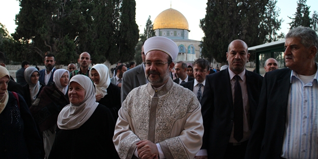 Prof. Dr. Görmez, Arap ülkelerinde yarın idrak edilecek Miraç Kandili dolayısıyla geldiği Kudüs'te, cuma namazını kıldırdığı Mescid-i Aksa'da Müslümanların yoğun ilgisiyle karşılaştı.