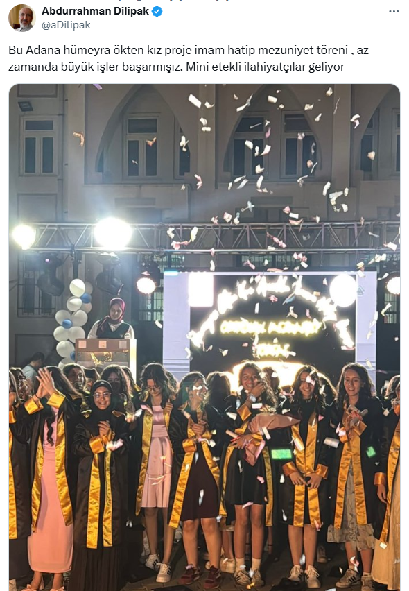 Dilipak, “Bu Adana Hümeyra Ökten Kız Proje İmam Hatip mezuniyet töreni, az zamanda büyük işler başarmışız. Mini etekli ilahiyatçılar geliyor” dedi.
