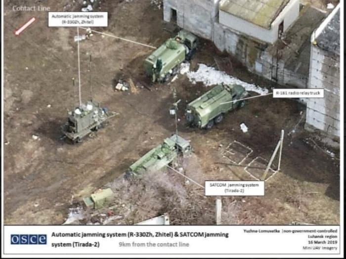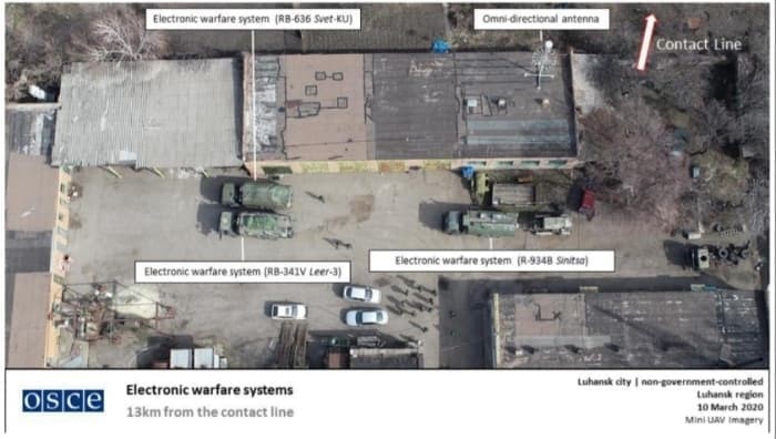 "Avrupa Güvenlik ve İşbirliği Teşkilatı Ukrayna Özel Gözlem Misyonu Rus ordusunun Ukrayna’da var olduğunu gösteren yeni deliller buldu. 10 Mart günü, bir mini İHA (İnsansız Hava Aracı) temas hattının 13 km güneyindeki Luhansk şehrinde bulunan bir tesiste Ruslara ait RB-636 Svet-KU, RB-341V Leer-3 and R-934B Sinitsa modeli 3 adet Elektronik Harp Silahı tespit etti. Avrupa Güvenlik ve İşbirliği Teşkilatı Ukrayna misyonu bu durumu yeni bildirdi. 16 Mart tarihli bu raporda Avrupa Güvenlik Ve İşbirliği Teşkilatına ait bir mini İHA’nın, Hükümet tarafından kontrol edilemeyen Luhansk bölgesine 9 km mesafedeki Yuzhna-Lomuvatka yakınlarında Ruslara ait “Tirana-2” ve R-330Zh “Zhytel” adlı bir çeşit karıştırma vazifesi icra eden elektronik harp silahı tespit ettiği belirtildi.