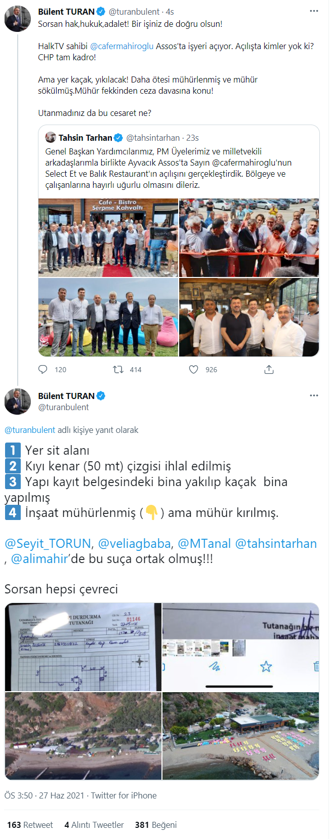 Açılışı paylaşan Tarhan'a sert tepki gösteren AK Parti Grup Başkanvekili ve Çanakkale Milletvekili Bülent Turan, "Sorsan hak, hukuk, adalet! Bir işiniz de doğru olsun! Halk TV sahibi Cafer Mahiroğlu Assos’ta işyeri açıyor. Açılışta kimler yok ki? CHP tam kadro! Ama yer kaçak, yıkılacak! Daha ötesi mühürlenmiş ve mühür sökülmüş. Mühür fekkinden ceza davasına konu! Utanmadınız da bu cesaret ne?" paylaşımında bulundu.