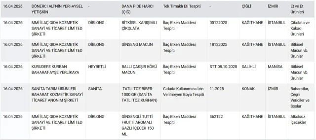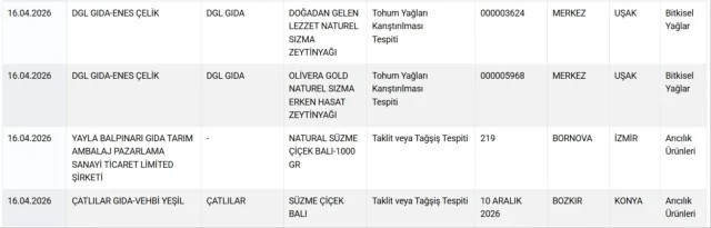 Son olarak 16 Nisan tarihli liste güncellenirken, bal, zeytinyağı, pide, kaşar peyniri, baharat, tatlı, tereyağı, kebap, köfte ve sucuk gibi birçok üründe uygunsuzluk tespit edildi.