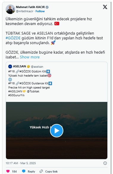 Türkiye'nin güvenliğini tahkim edecek projelere hız kesmeden devam ettiklerini vurgulayan Kacır, "TÜBİTAK SAGE ve ASELSAN ortaklığında geliştirilen GÖZDE Güdüm Kiti'nin F16'dan yapılan hızlı hedefe test atışı başarıyla sonuçlandı. GÖZDE, ülkemizde bugüne kadar, atışlarda en hızlı hedefi isabet eden güdüm kiti oldu." ifadelerini kullandı.