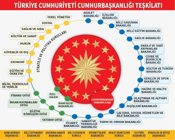 Cumhurbaşkanı Recep Tayyip Erdoğan’ın Cumhurbaşkanlığı seçimini kazanmasının ardından yeni Cumhurbaşkanlığı Hükümet Sistemi de bütün kurum ve kurallarıyla hızlıca yaşama geçecek. Erdoğan, yemin etmeden önce hükümet yetki kararnameleri ile sistemin alt yapısını hazırlayacak. Yeni dönemde 16 bakanlık, dokuz kurul, dört ofis için altyapı oluşturulacak. Erdoğan, bu koltuklara hızlı biçimde atama yapacak. Meclis’te yemin edilmesinin hemen ardından Erdoğan’ın yeni kabine çalışmaları da başlayacak. Erdoğan’ın bu süreçte MHP lideri Devlet Bahçeli ile de bir araya gelmesi bekleniyor. Kabinede MHP’den ya da “MHP’ye yakın” isimlerin de yer bulabileceği belirtiliyor.