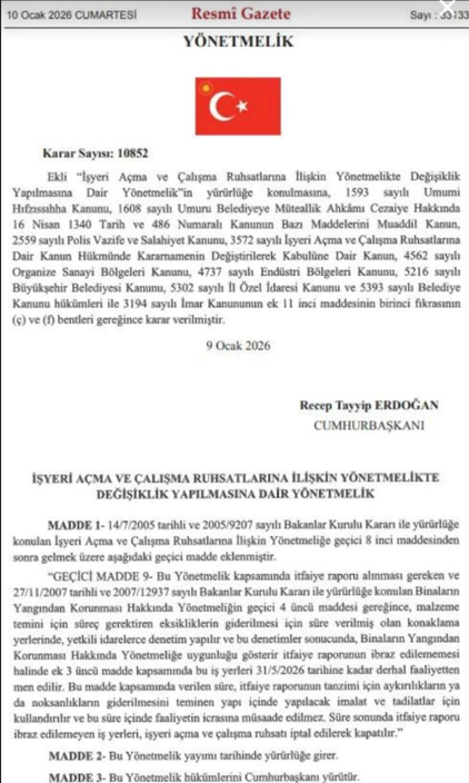 Cumhurbaşkanı Recep Tayyip Erdoğan’ın imzasıyla 10 Ocak 2026 tarihli Resmî Gazete’de yayımlanan devrim niteliğindeki kararname, turizm sektöründe kartları yeniden dağıtıyor. İş Güvenliği Uzmanı Nasuh Boztepe’nin de dikkat çektiği üzere; artık "yangın uygunluk belgesi" (itfaiye raporu) bulunmayan otellerin gözünün yaşına bakılmayacak.