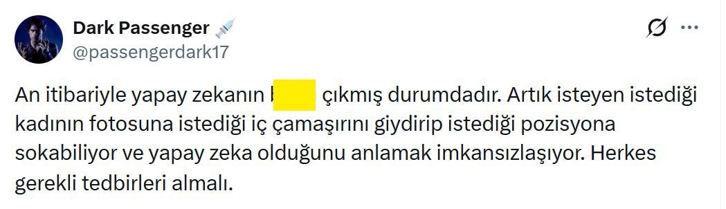 Grok’taki kontrolsüz üretim, sosyal medyada büyük tepki çekti. İstismarcı müptezellere sapıklıklarını yaymak için fırsat tanıyan bu rezillik, sağ duyulu insanları çileden çıkarıyor. Bir kullanıcı, karşılaştığı skandal mesajı kendi hesabından yayınlayarak herkesi uyardı. Buna göre bir ahlaksız, kadının fotoğrafını Grok’a yükleyerek, uygunsuz bir görsel üretti. Bu rezilliği paylaşan sayfa, “Artık herkes gereken önlemi almalı” ifadesini kullandı.