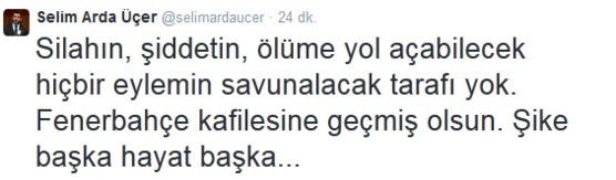 Fenerbahçe kafilesine Trabzon yolunda yapılan saldırı kınanırken, Galatasaraylı yönetici Selim Arda Üçer'in attığı "Şike başka hayat başka..." Tweet'i tepki çekti.