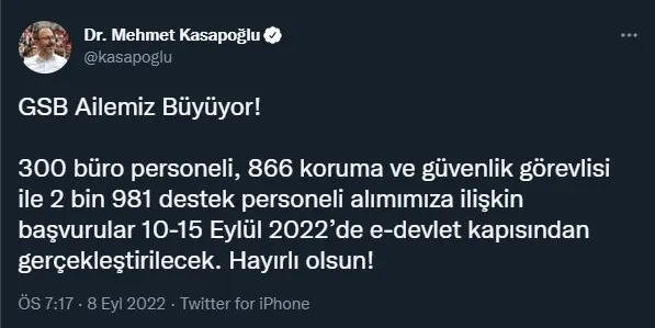 "GSB Ailemiz Büyüyor! 300 büro personeli, 866 koruma ve güvenlik görevlisi ile 2 bin 981 destek personeli alımımıza ilişkin başvurular 10-15 Eylül 2022'de e-devlet kapısından gerçekleştirilecek. Hayırlı olsun!"