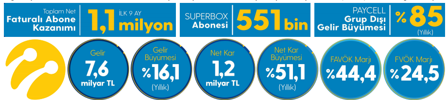 Abone adetlerini arttırdıklarına işaret eden Erkan, “Üçüncü çeyrekte 317 bin faturalı müşteri ailemize dahil oldu. Yıl başından beri de 1.1 milyon faturalı müşteri bizi tercih etti” dedi. Erkan, kuvvetlerine kuvvet kattıklarına ve 2020 sonu için belirledikleri hedefleri konsolide gelir büyümesi hedefini yüzde 14-15’e çıkardıklarına dikkat çekti.