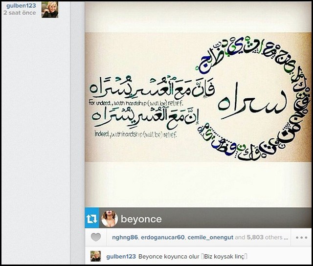 Dünyaca ünlü şarkıcı Beyonce, Kur'an’daki İnşirah Suresi’nden alıntı yaparak Instagram’da paylaşım yaptı. Beyonce, bu sureden, “Elbette zorluğun yanında bir kolaylık vardır” ve “Gerçekten, zorlukla beraber bir kolaylık daha vardır” mealindeki ayetleri paylaştı.
