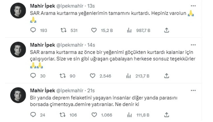 Oyuncu Mahir İpek, Twitter hesabından yaptığı paylaşımda depremde yeğenlerinin enkazda kaldığını söyledi. Oyuncu, "SAR arama kurtarma az önce bir yeğenimi göçükten kurtardı kalanlar için çalışıyorlar. Size ve siz gibi uğraşan çabalayan herkese sonsuz teşekkürler" dedi.